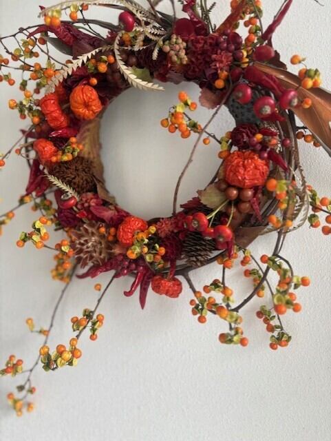 ツルウメモドキ・バラの実・トウガラシ・松かさ・ローズヒップ・ソラナス・ドライアンドラ・など赤オレンジ系でアレンジしました。