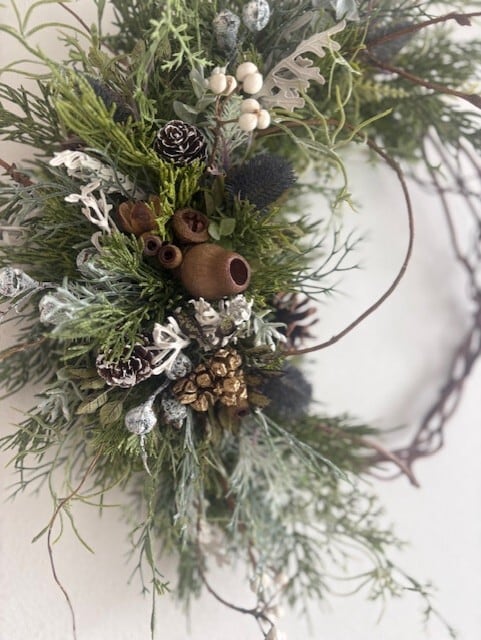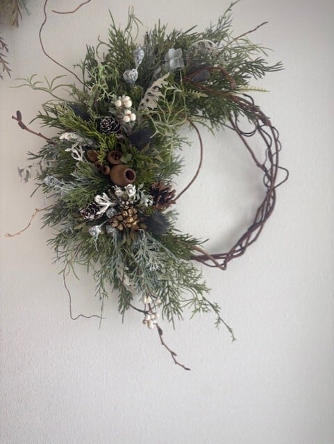 アシンメトリーなデザインが特徴のリースは、縦にも横にも飾ることのできるリース
