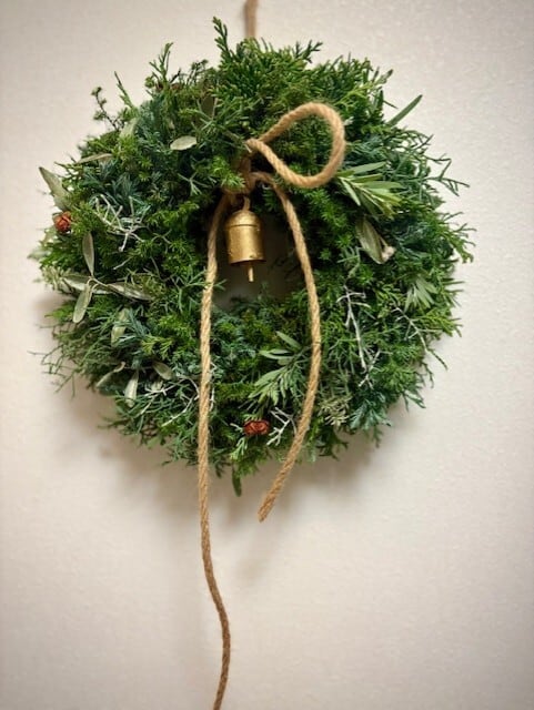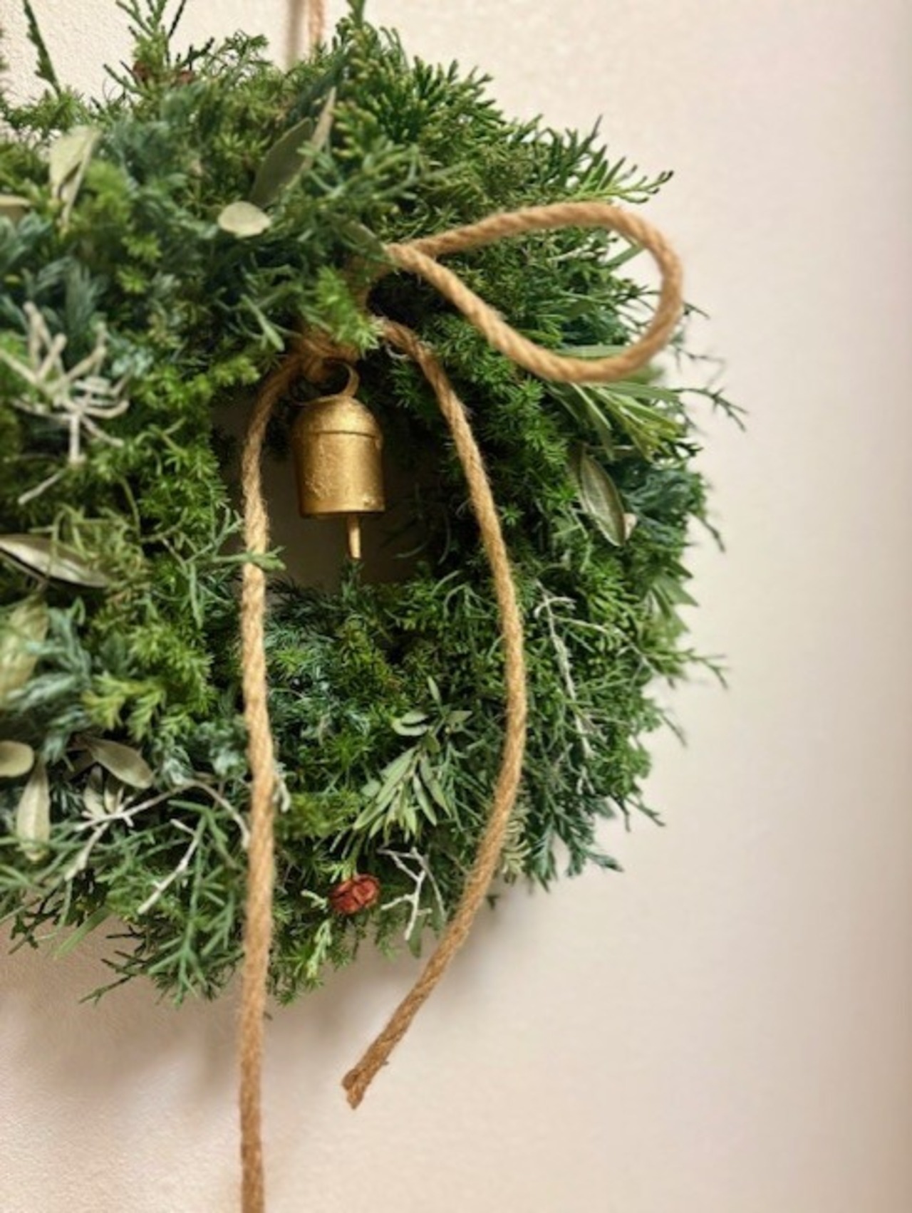 ヒムロ杉、ブルーアイス、コニファー、アカシア、ロシアンオリーブなどのグリーンをシンプルにアレンジし、アンティークベルをあしらいました。