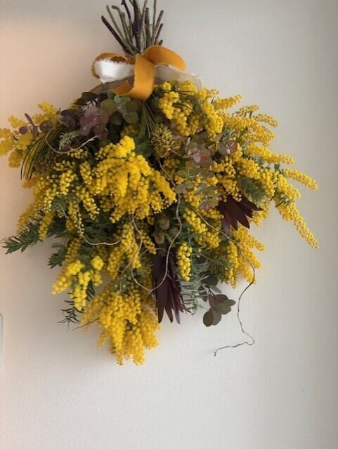 春の訪れを感じさせる、華やかなミモザスワッグです。