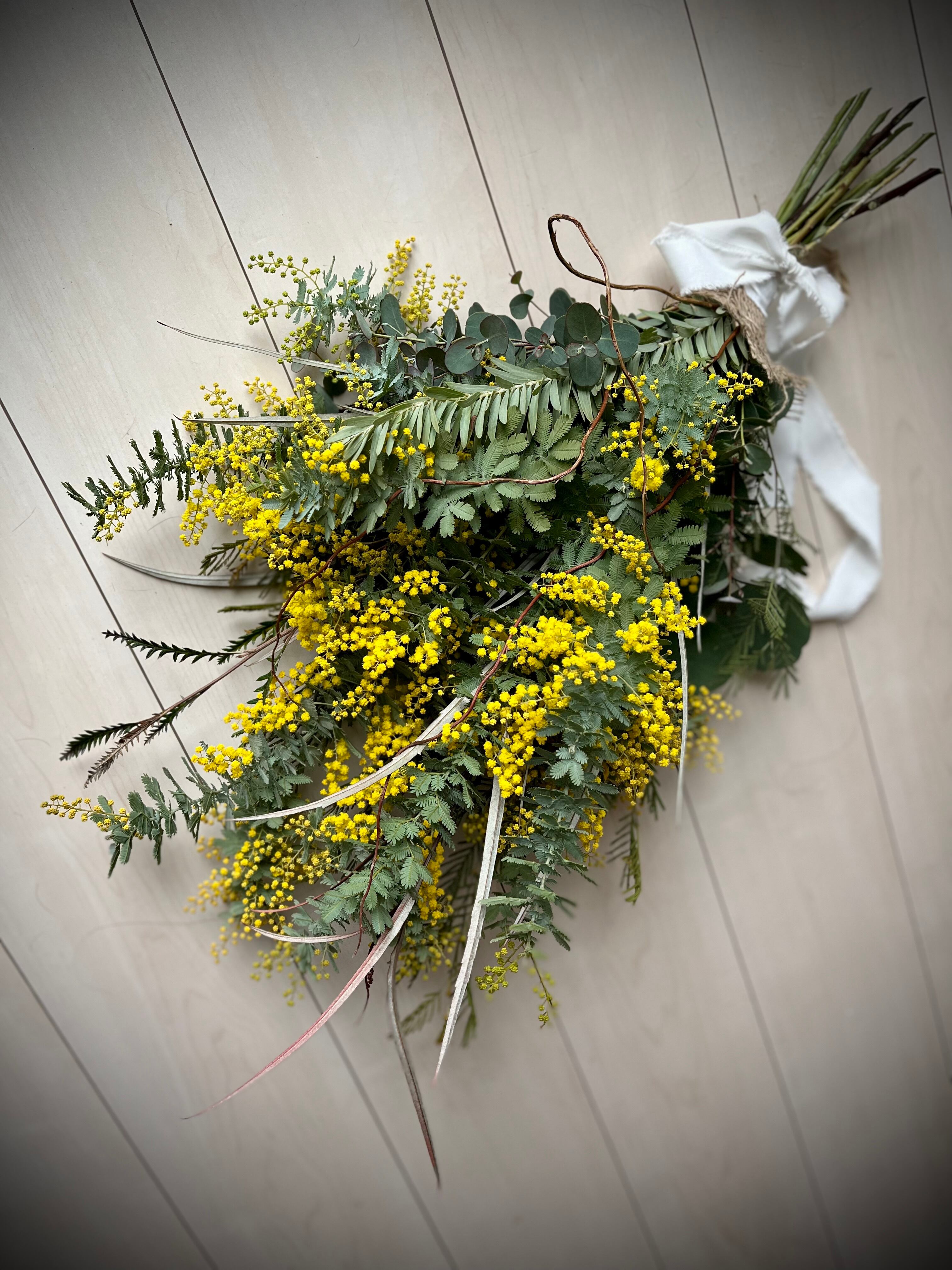 ミモザのふわふわとしたお花は、1~2日で収縮しドライフラワーへと移り変わります。その変化もお楽しみいただけたらと思います。