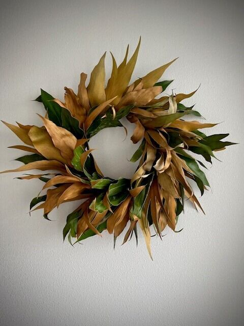 グレビレアゴールドは表裏のグリーン・ブラウンの美しい色合いとその光沢から、おしゃれで豪華でとても貴重な花材の一つです。贅沢にリースにすることでインテリアの空間のアクセントになり、お部屋に優雅さと温かみを感じていただけます。