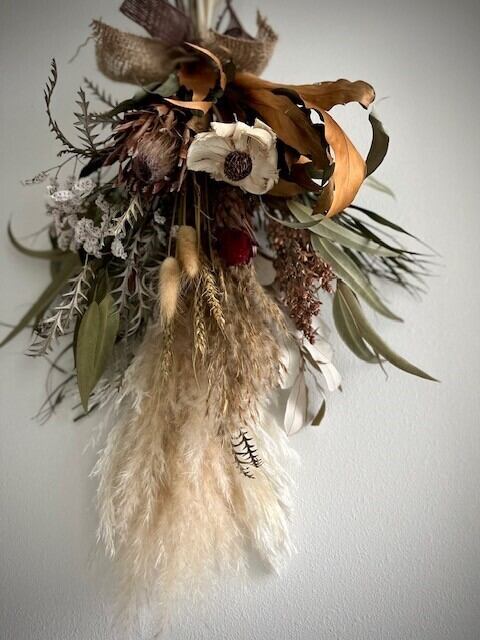 自然の美しさを楽しむ、ブラウンカラーのドライフラワースワッグ*ブーケ。贈り物にもおすすめのアイテムです。色合いは温かみのあるブラウンを基調とし、秋の先取りとなる花々と葉っぱを組み合わせました。インテリアに馴染むナチュラルな雰囲気で、お部屋のアクセントにぴったりです。