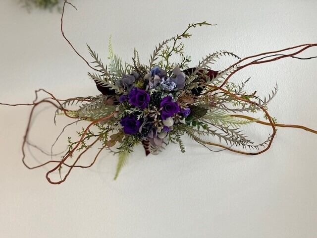バラ、アジサイ、グレビレアアイバンホー、ユーカリ、ドラゴン柳、シルバーブローニャ、チースなど、シックなイメージで作らせていただきました。