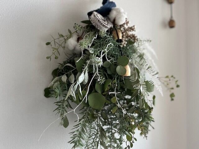 クリスマスのお部屋を演出する、X'masスワッグです。ホワイトカラーでシンプルにまとめました。フレッシュな針葉樹、ヒムロスギ・ブルーアイス・ユーカリ・アカシアなどのグリーンを使用、ゆっくりと落ち着いた色味へと変化し、少しづつドライとなっていきます。ドアや窓に飾るだけで、冬の風情とグリーンの香りが広がります。