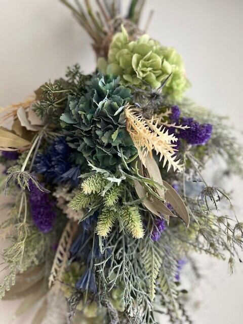 アジサイ、エリンジューム、ユーカリ、グレビレア、ニゲラ、チースなど、アーティフィシャルフラワーとドライフラワーをミックスし、ブルー紫グリーンホワイトカラーで涼しげにアレンジいたしました。