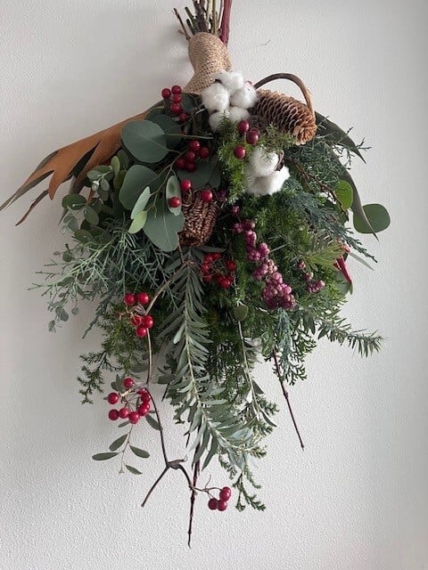 クリスマスのお部屋を演出する、X'masスワッグです。Redカラーでクリスマスにぴったりの色合いにまとめました。フレッシュな針葉樹、ヒムロスギ・ブルーアイス・ユーカリ・アカシアなどのグリーンを使用、ゆっくりと落ち着いた色味へと変化し、少しづつドライとなっていきます。ドアや窓に飾るだけで、冬の風情とグリーンの香りが広がります。